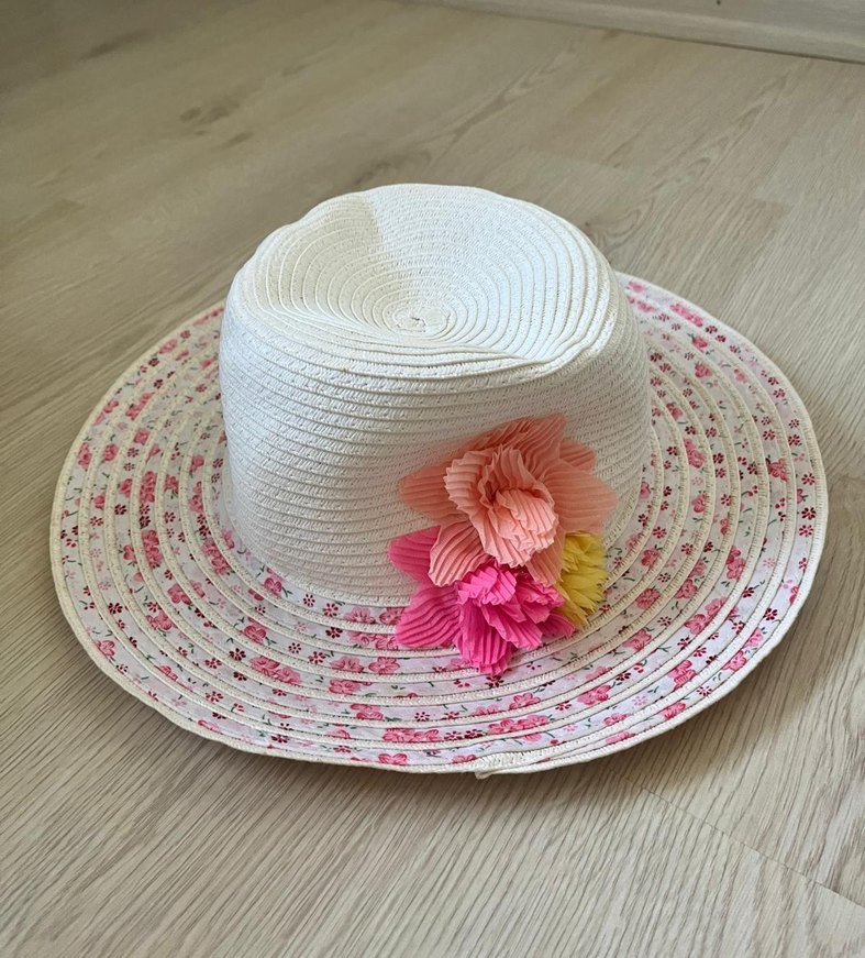 Sentetik kumaştan üretilmiş, renkli fırfırlı çiçek detaylı, geniş desenli kenarlı bohem tarzı kadın şapkası.