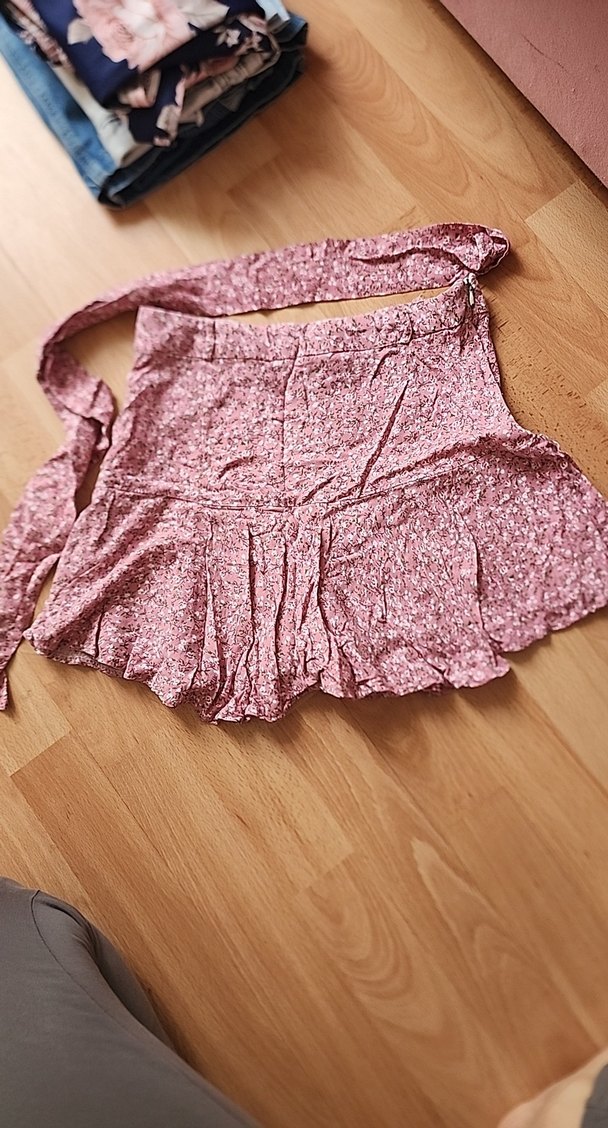 Pembe renkli, yumuşak sentetik kumaştan yapılmış, bol kesim ve fırfır detaylı mini etek. Pastel tonu ve bohem tarzıyla günlük kullanıma uygun.