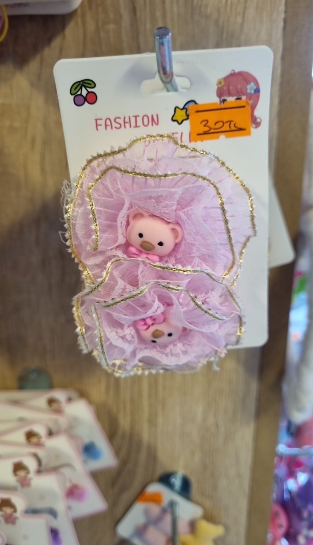 Pembe renkli, fırfırlı ve baskılı desenli çocuk saç tokası, sevimli ayıcık figürlü. Üzerinde "FASHION" yazısı var.