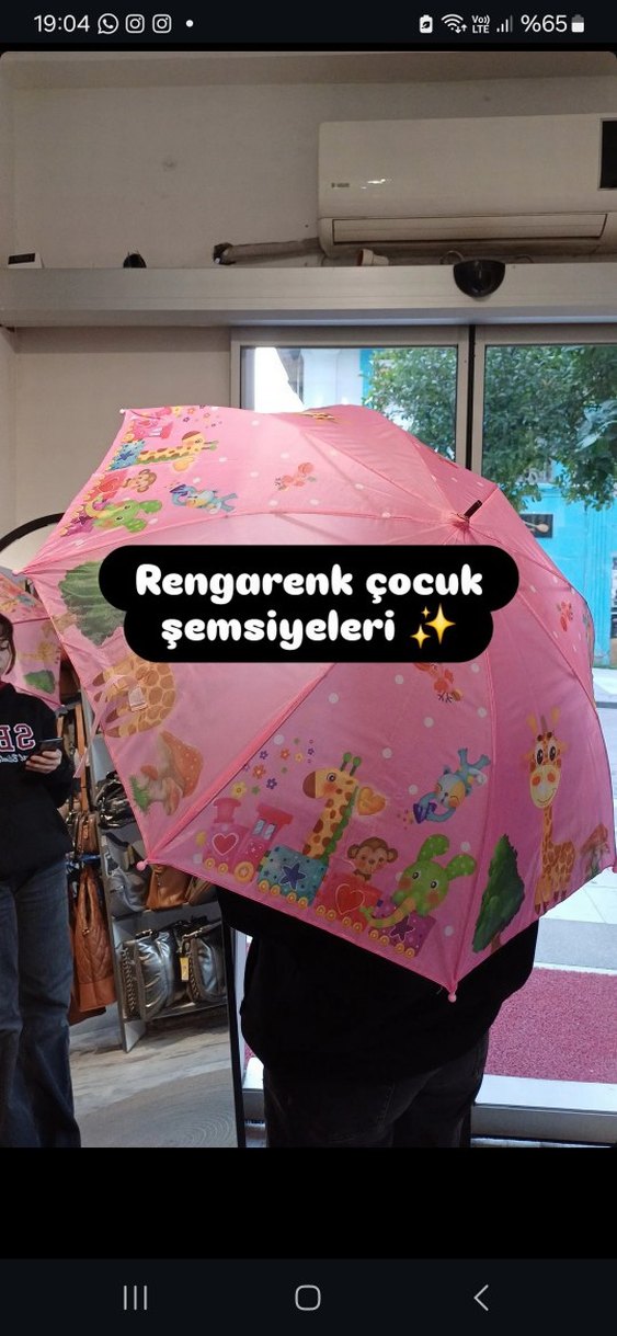 Pastel pembe renkte, rengarenk hayvan desenli ve fırfırlı kenarlı çocuk şemsiyesi. Modest ve rahat tarzlar için uygundur.
