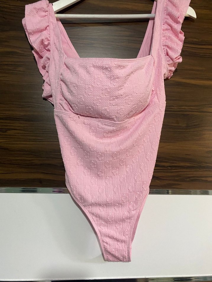 Pembe renkli, fırfırlı detaylı ve askılı, vücuda oturan kadın mayo. Cesur ve bohem tarzda, plaj için uygun, pastel renkte ve desensiz tasarım.