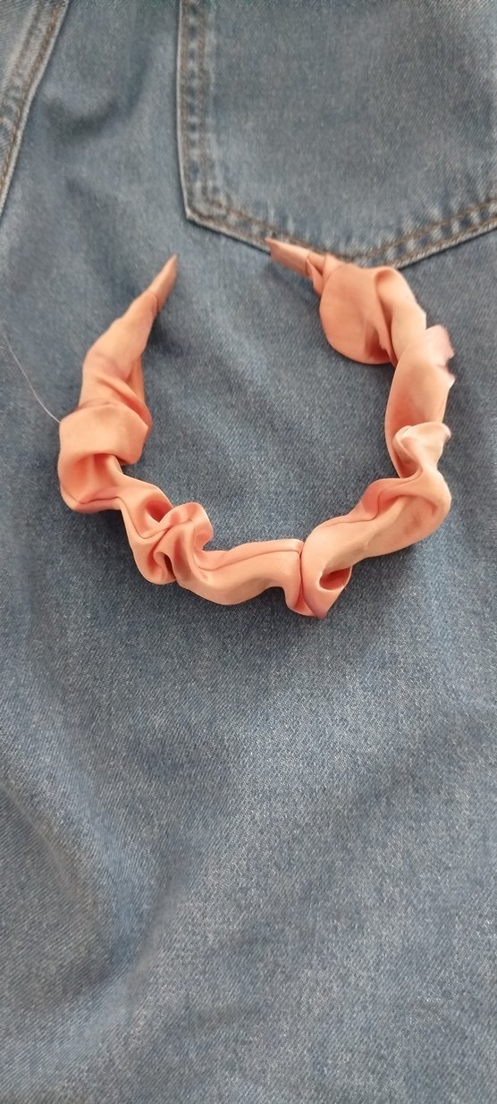 Pastel pembe renkte, sentetik kumaştan yapılmış fırfırlı saç bandı. Minimalist ve streetwear tarzına uygun, moda tutkunları için ideal.