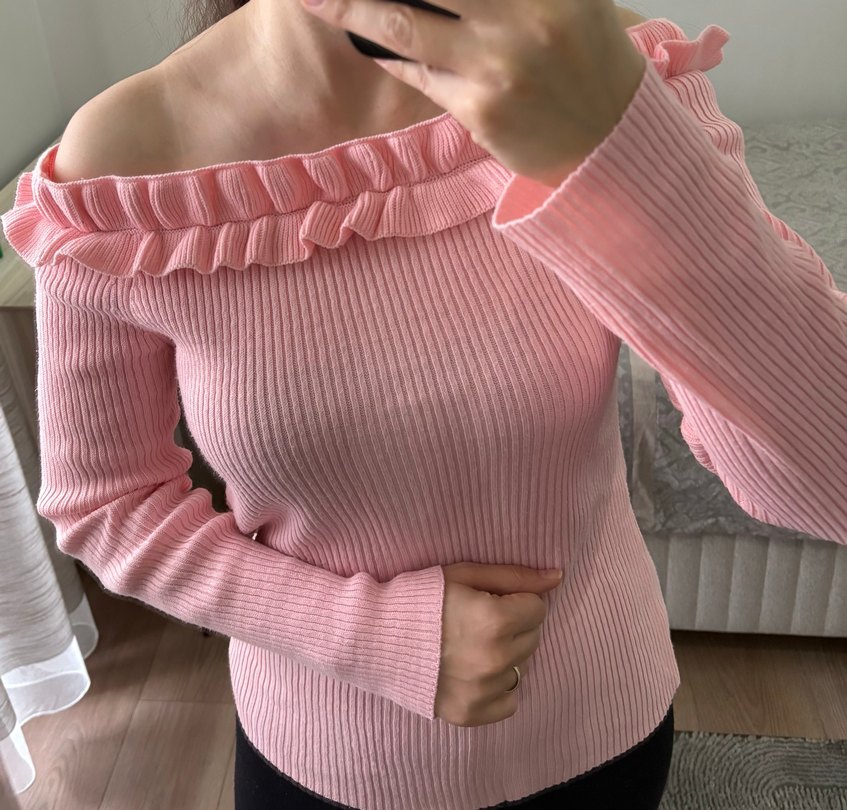 Pembe, kayık yakalı ve fırfırlı detaylara sahip, uzun kollu, vücuda oturan triko kazak. Rahat ve şık bir gündelik tercih.