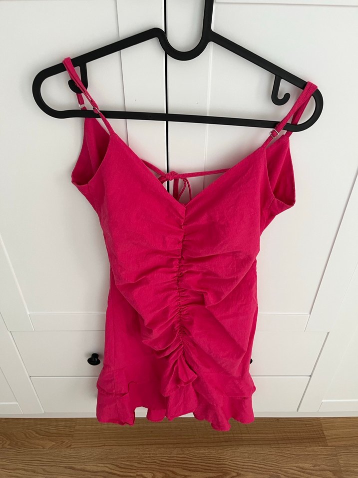 Pembe Fırfırlı Keten Mini elbise