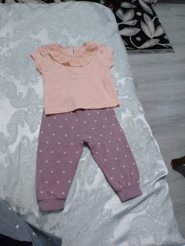 Pastel pembe kısa kollu, fırfırlı üst ve beyaz puantiyeli yumuşak mor pantolonlu bebek kız takımı. Rahat ve şık. 12-18 aya uygundur