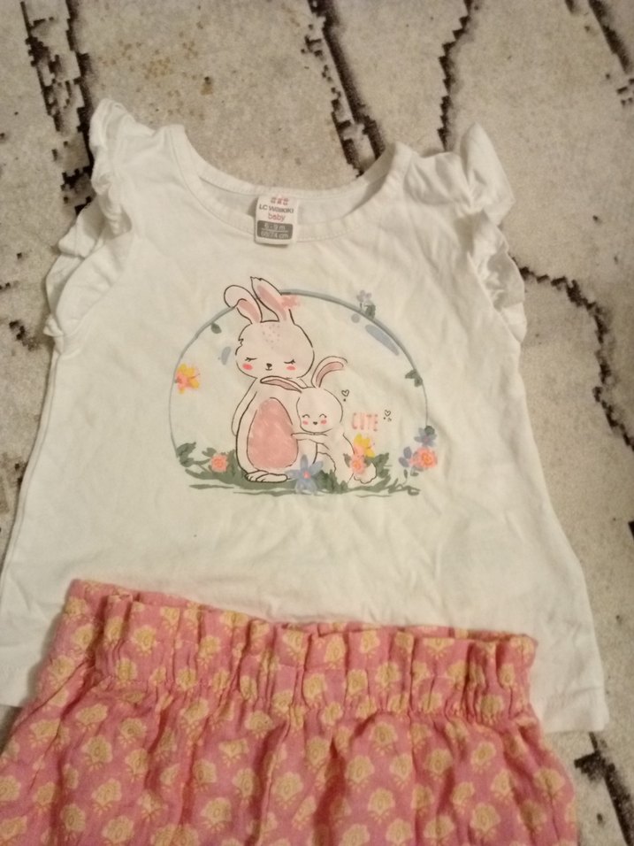 Kısa kollu, fırfırlı üstünde iki tavşan baskısı bulunan bebek kız takımı. Pastel pembe, desenli rahat alt parçalar içerir.