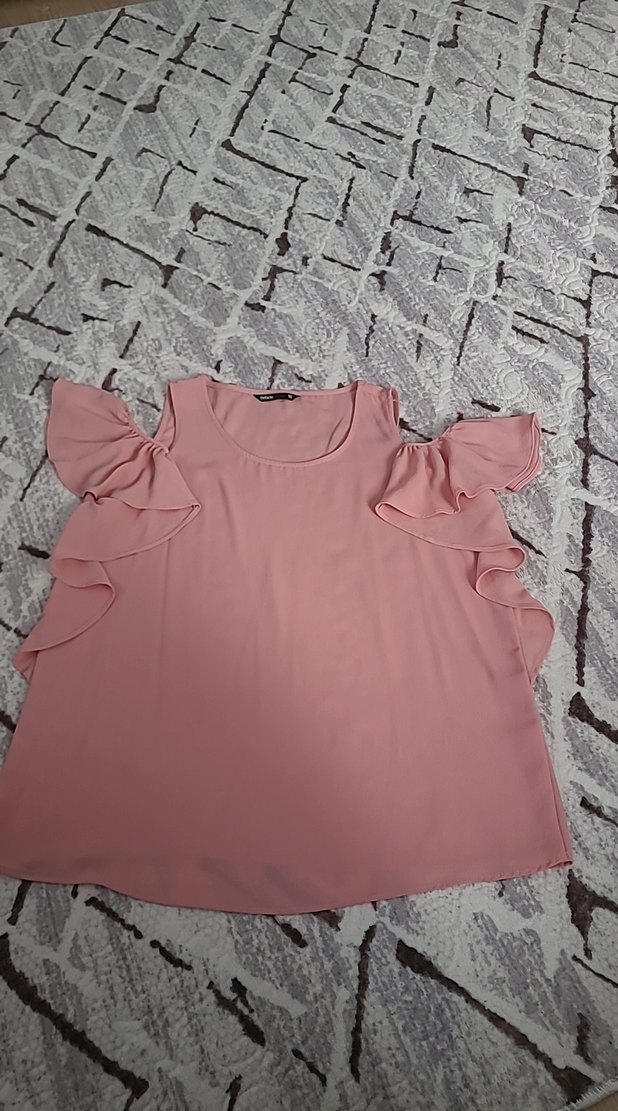 Yumuşak sentetik kumaştan, yanlarda fırfır detaylı, kısa kollu, pembe ve rahat kesim normal boyda bluz. Straplez yakaya sahiptir.