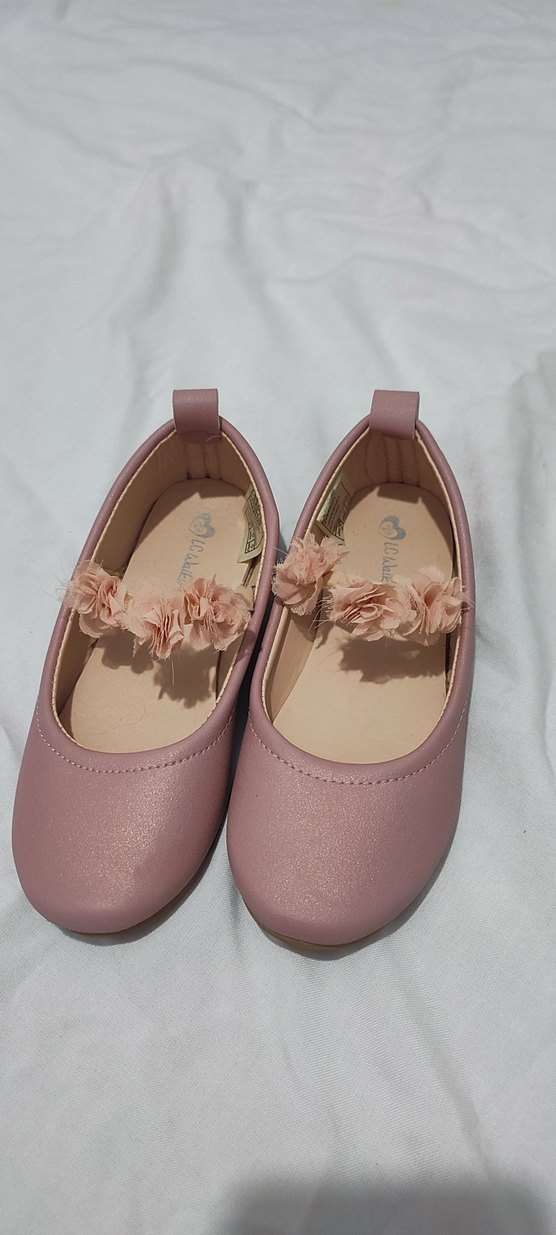 Pembe renkli, çiçek desenli fırfırlı bantlı kız babetleri, yumuşak kauçuk malzemeden üretilmiştir.