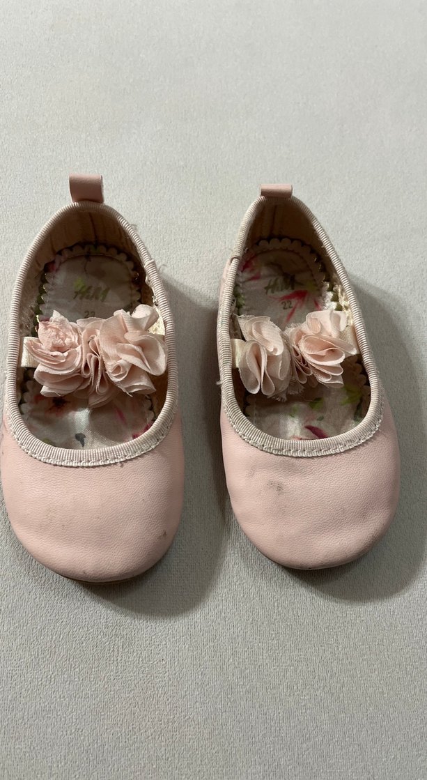 Pembe pastel tonlarında, yumuşak fırfır detaylı, bohem tarzda kızlar için babet ayakkabı. Esnek kullanım için kauçuk malzeme.