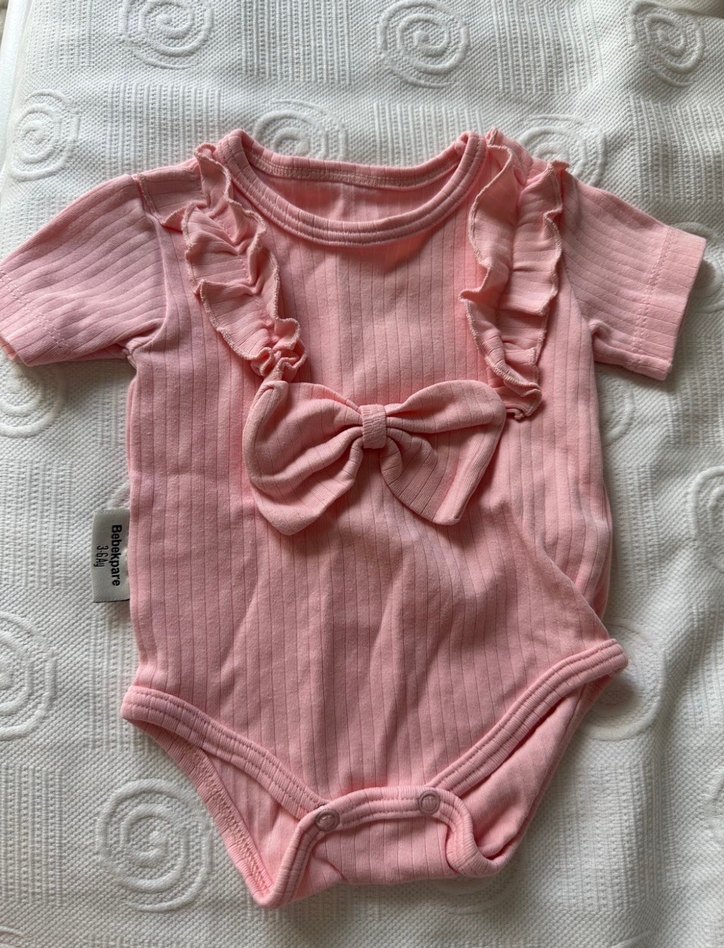 Kısa kollu, bisiklet yaka, pembe kız bebek body. Yumuşak dokulu kumaş, önünde fiyonk ve fırfır detayları bulunur.