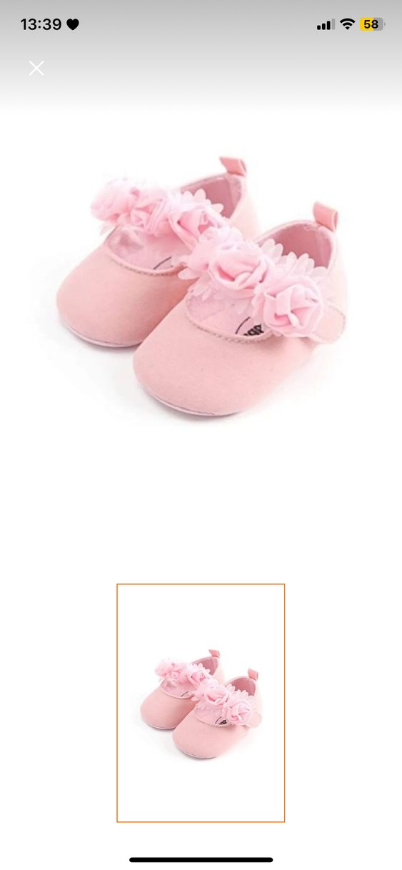 Pembe tonlarında, çiçek desenli fırfır detaylı, yumuşak kauçuk tabanlı kız bebek ilk adım ayakkabısı.