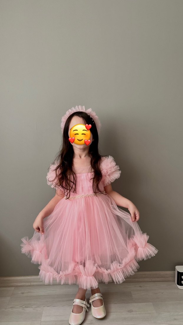 Pembe renkli, straplez yakalı, fırfır detaylı ve bağlama desenli, yumuşak sentetik kumaştan yapılmış, vücuda oturan kız çocuk abiye elbise. Sadece 1 kez giyildi