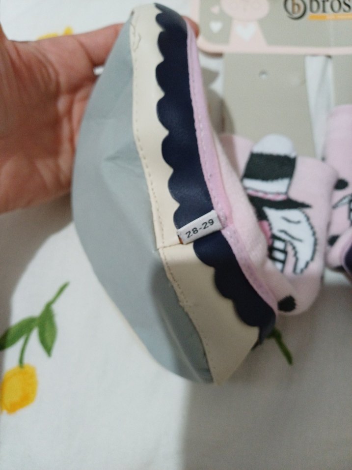 Pembe renkli, lastik tabanlı kız çocuk ev terliği. çarık çorap Renkli puantiyeli baskı ve fırfır detayına sahiptir. Üzerinde "Obross" markası bulunur.sıfır ürün