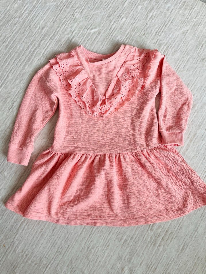 Pembe pastel renkli, uzun kollu, yuvarlak yakalı kız çocuk elbisesi. Nakışlı fırfır detayları ve bol kesimiyle rahatlık sağlar.