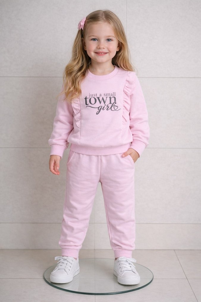 5-6 yaş 7-8 yaş Pastel pembe renkte, bol kesim kız çocuk eşofman takımı. Fırfır detaylı, baskılı ve uzun kollu, yuvarlak yakalı, yumuşak ve sıcak kumaştan üretilmiştir.