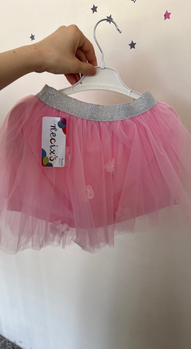 Parlak bel bantlı, yumuşak sentetik kumaştan yapılmış, fırfırlı pembe fit kesim etek. Necix's marka, baskılı ve sokak modası tarzında. 3/4 yaş