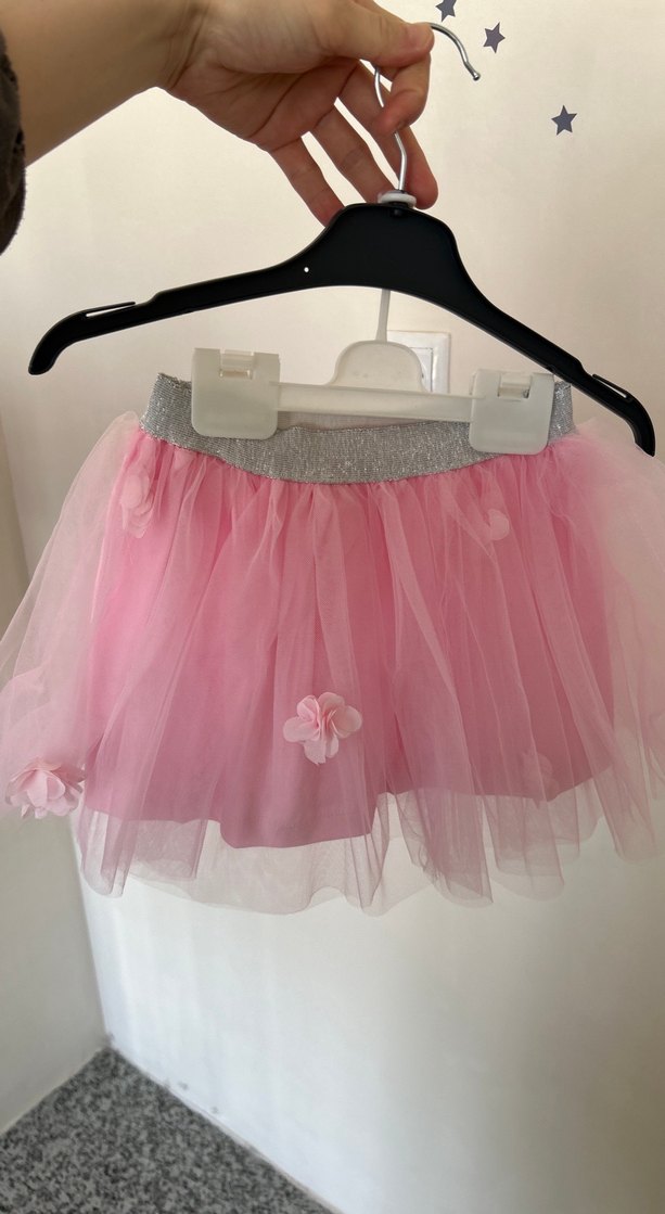 Pembe, fırfırlı ve yapay kumaştan yapılmış, gümüş elastik bel bantlı kız çocuk eteği. Pastel tonlarda, sokak modası stilinde. 2/3 yaş