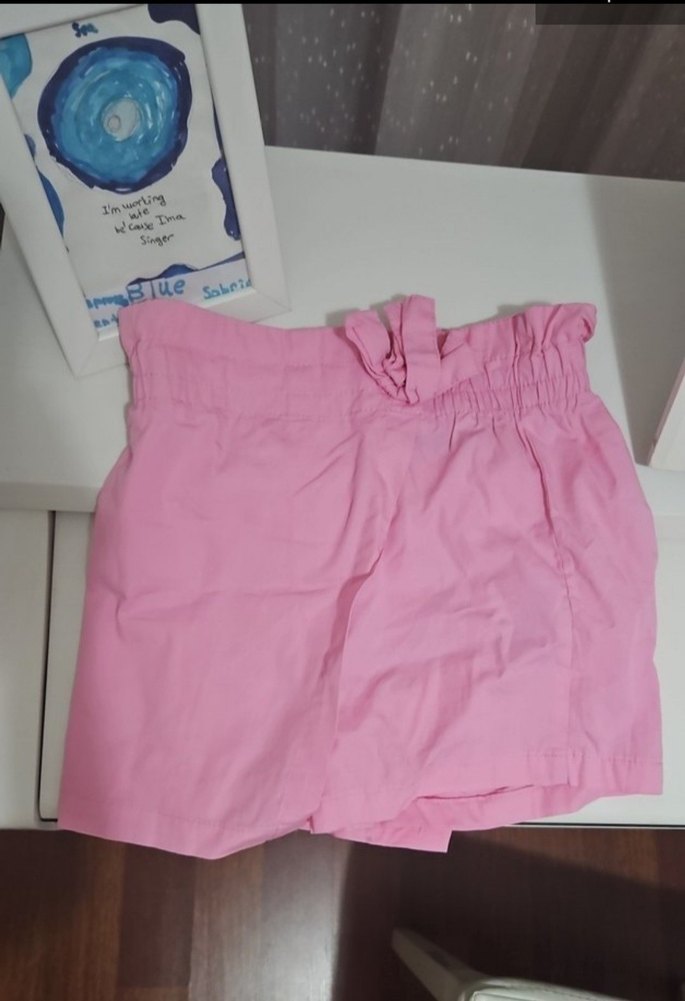 Pembe renginde, bel kısmında fırfır detaylı, gevşek kesim kız çocuk şortu. Yumuşak sentetik kumaştan üretilmiştir.
