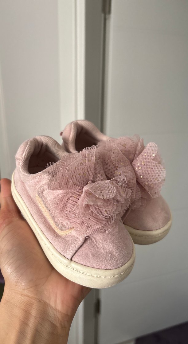 Pembe renkli, çiçek desenli ve fırfırlı detaylı kız çocuk spor ayakkabısı, kauçuk tabanlıdır ve rahat sokak stili için uygundur.