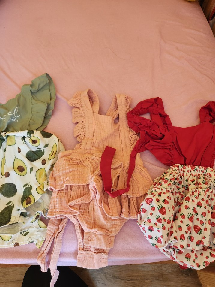 Pembe renkte, kolsuz ve fırfırlı detaylara sahip bebek kıyafet seti. Yumuşak kumaştan üretilmiş, renkli ve desensiz tasarıma sahiptir.