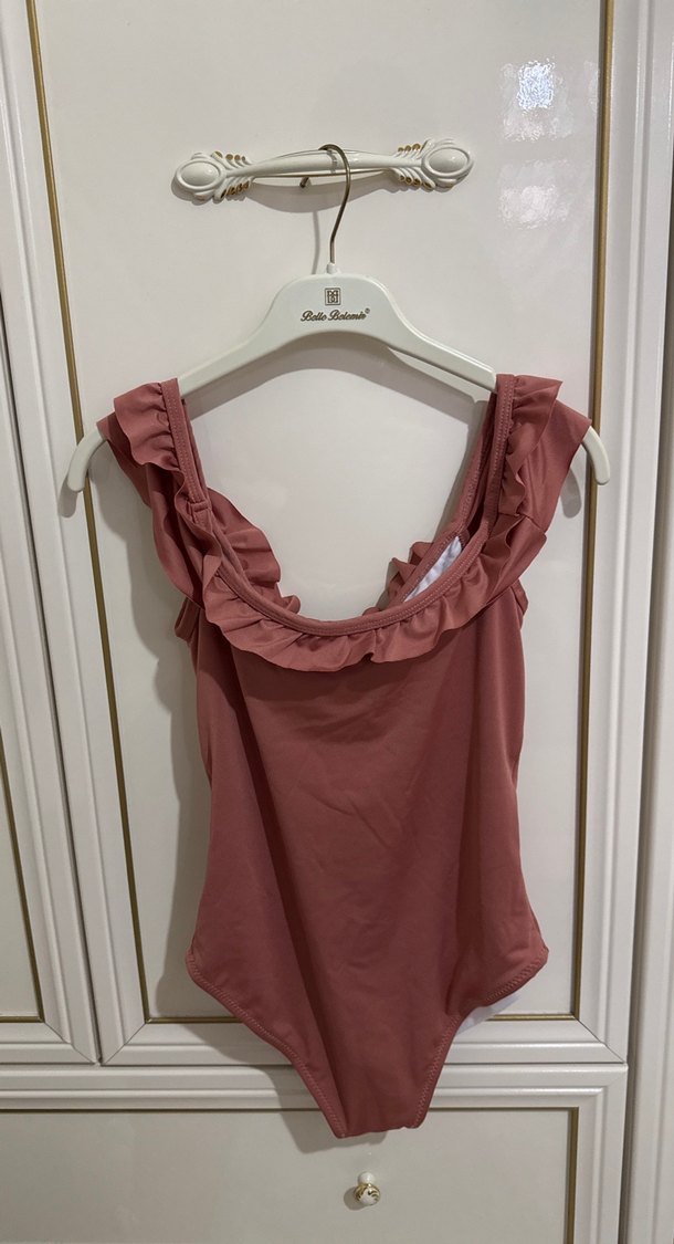 Kolsuz ve vücuda oturan bu kadın mayosu, yakasında fırfır detayına sahiptir. Pastel pembe renkte, midi boyda ve minimalist sokak stiliyle günlük kullanıma uygundur.