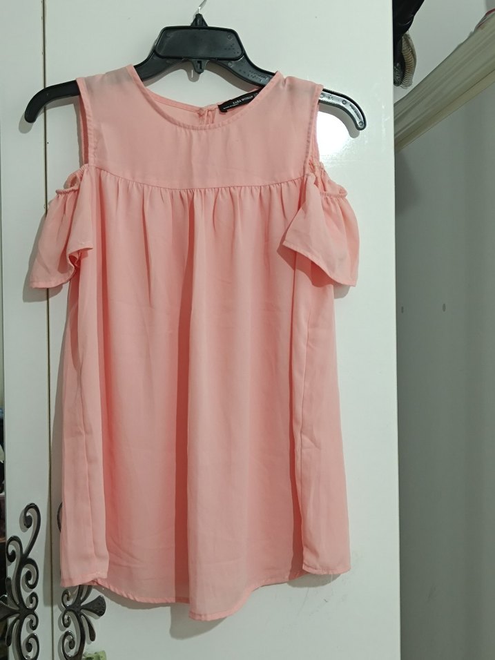 Pembe pastel renkte, kolsuz ve salaş kesimli, fırfır detaylı bluz. Sentetik yumuşak kumaştan, straplez yaka ve normal boyda, günlük kullanıma uygun.