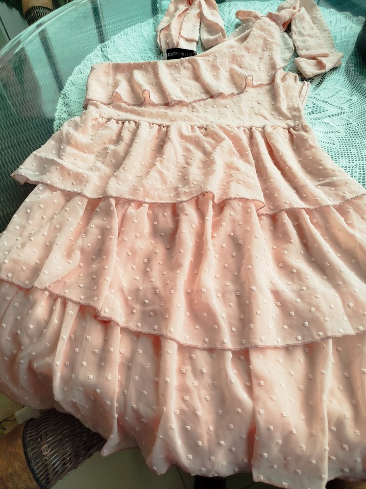 Yavruağzı rengi az kullanılmış defosuz mezuniyet elbisesi. fırfırlı katmanları ve yumuşak sentetik kumaşıyla bohem tarzını yansıtır.