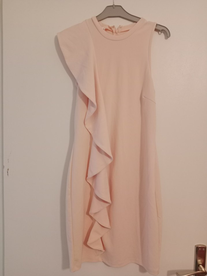 Pembe pastel renkte, kolsuz, yüksek yakalı midi elbise. Tek yanda fırfır detayı ve vücuda oturan kesimiyle minimal ve çağdaş tarzda.