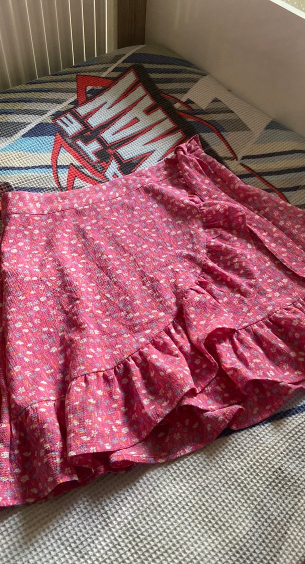 Sentetik kumaştan, bol kesim pembe midi mini etek. Fırfır detaylı ve bohem tarzda, günlük kullanıma uygun renkli desenli