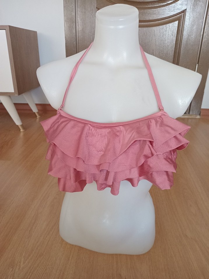 Pembe pastel renkte, askılı ve kat kat fırfırlı, bol kesim bohem tarzda mini bikini üstü.