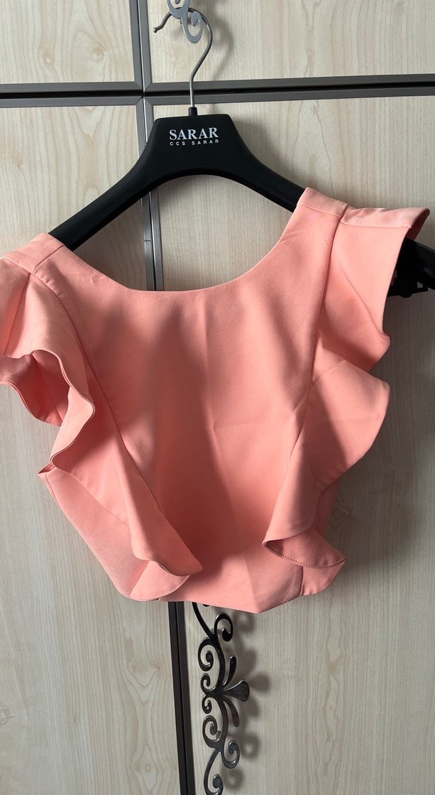 Pembe, suni kumaştan yapılmış, V yakalı ve fırfırlı detaylı, kısa ve dar kesim kolsuz bluz. Günlük kullanıma uygun, çağdaş Paris tarzı.