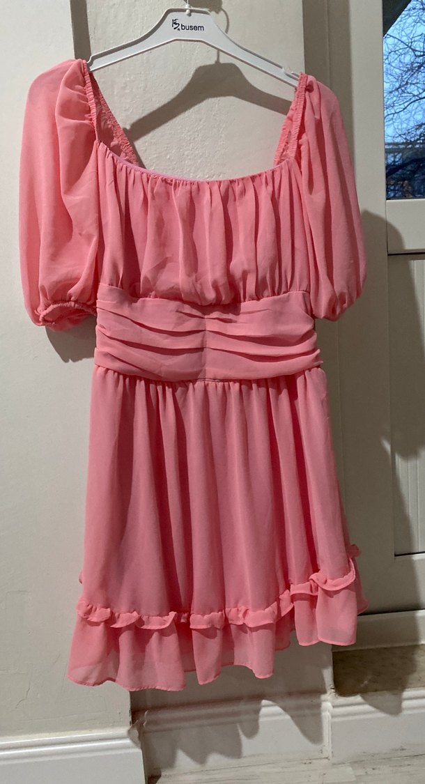 Bu pembe mini elbise, tekne yaka ve fırfır detaylarına sahiptir. Yumuşak sentetik kumaştan yapılmış, bohem tarzda parti için uygundur.