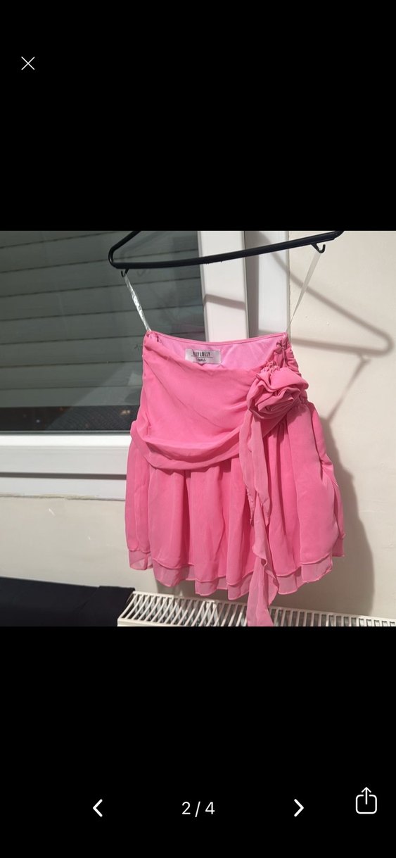Pembe renkli, fırfırlı ve bol kesim mini etek. Yumuşak sentetik kumaştan üretilmiş, parti ve sokak stiline uygun.