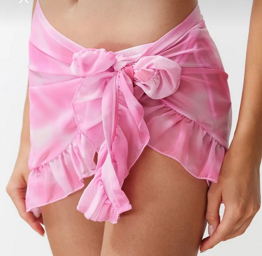 Pembe tie-dye desenli, fırfırlı ve mini boy, ince askılı, vücuda oturan pareo, gösterişli parti tarzı için uygun.