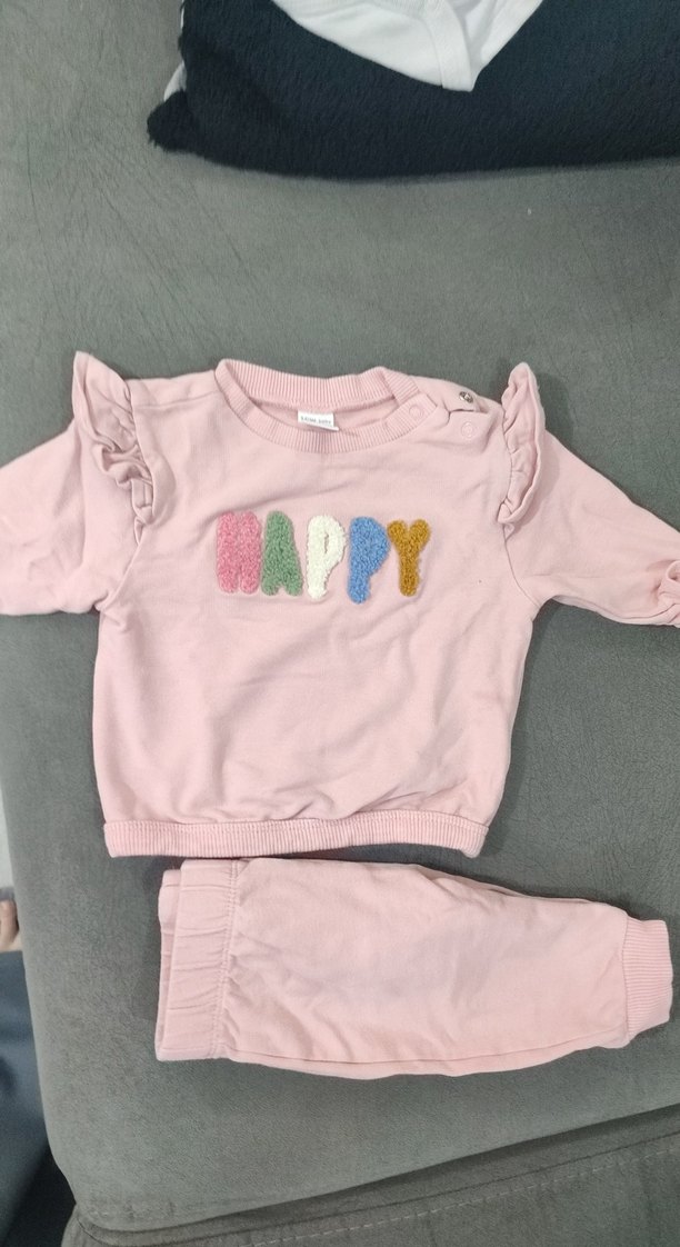 Pastel pembe renkli bebek kız takımı, uzun kollu ve fırfır detaylıdır. "HAPPY" nakışlı renkli harfler bulunur, yumuşak kumaştan üretilmiştir.