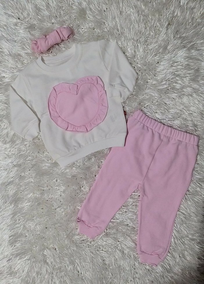 18-24 Ay , beyaz uzun kollu üstte renkli fırfırlı kalp deseni, pembe fırfırlı alt ve pembe saç bandından oluşan kız bebek 3'lü takım. %100 Pamuk, rahat ve yumuşak kumaş.