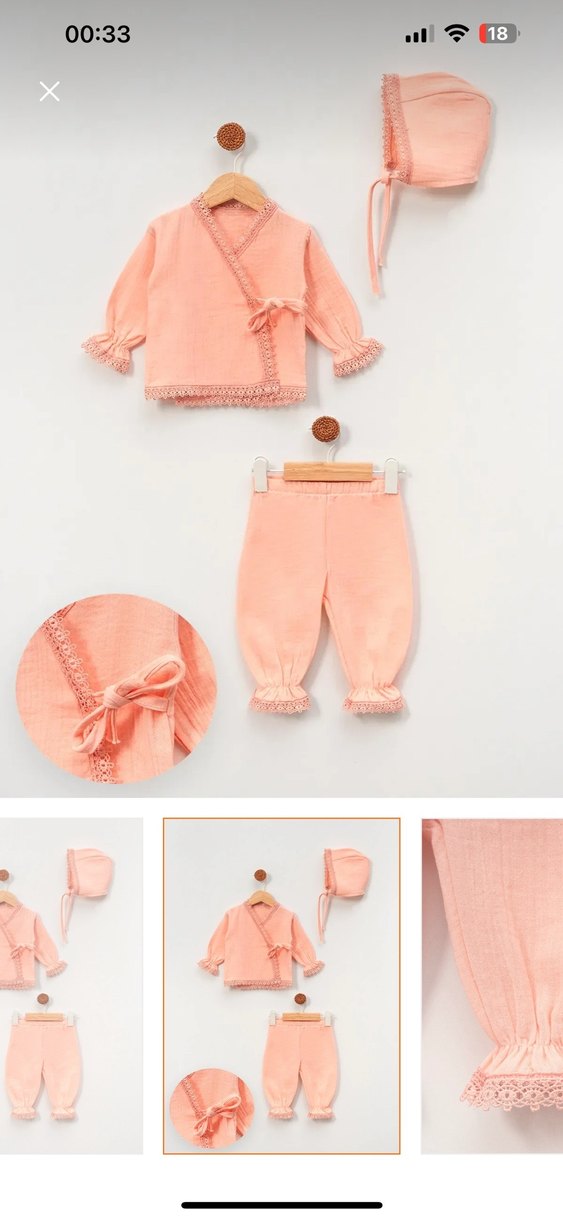Nakışlı detaylar, fırfırlı süslemeler ve askılı kollara sahip pastel pembe bebek kız takımı. Ceket, pantolon ve şapka içerir . Müslin kumaştır hiç kullanılmadı