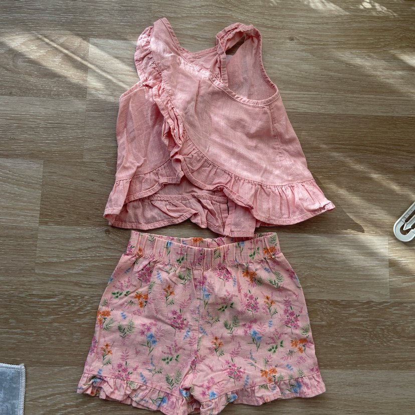 Pastel pembe renkte, fırfırlı ve nakış detaylı kolsuz üst ile çiçek desenli, fırfırlı etek uçlu şorttan oluşan bebek kız takımı.