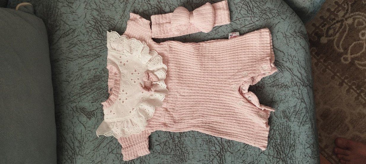 Yumuşak fitilli kumaştan yapılmış, nakışlı desenlere ve fırfır detaylara sahip pastel pembe bebek tulumu. Uyumu baş bandı ile birlikte.