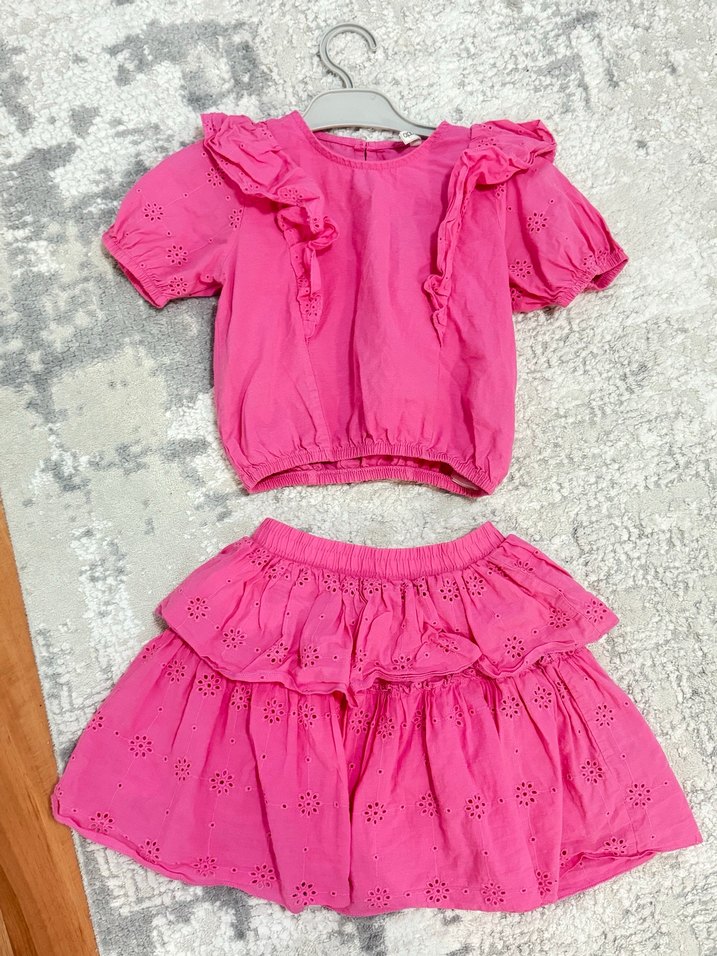 Pembe kısa kollu üstü fırfırlı ve renkli nakış detaylarına sahip, altı katmanlı fırfırlı nakışlı etekle tamamlanan kız bebek takımı.