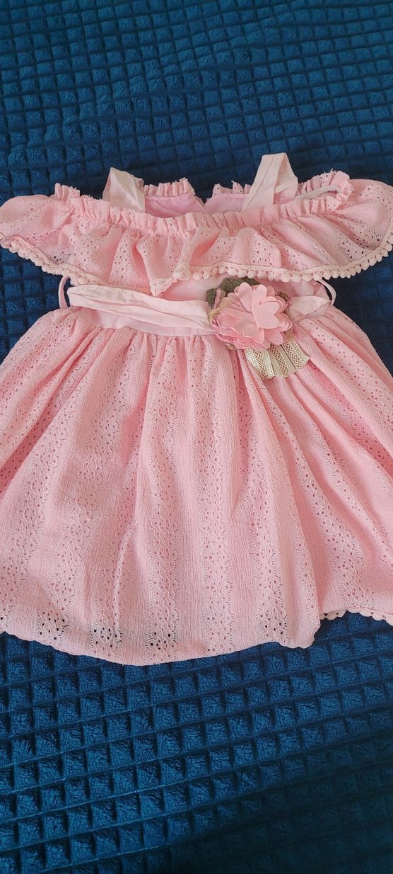 Pembe renkli, fırfırlı ve nakış detaylı kız elbisesi. Askılı ve straplez yakalı, bohem tarzda, yumuşak sentetik kumaştan. Çiçekli kemer süsü bulunur. ufak bir yiritigi var resimde mevcut