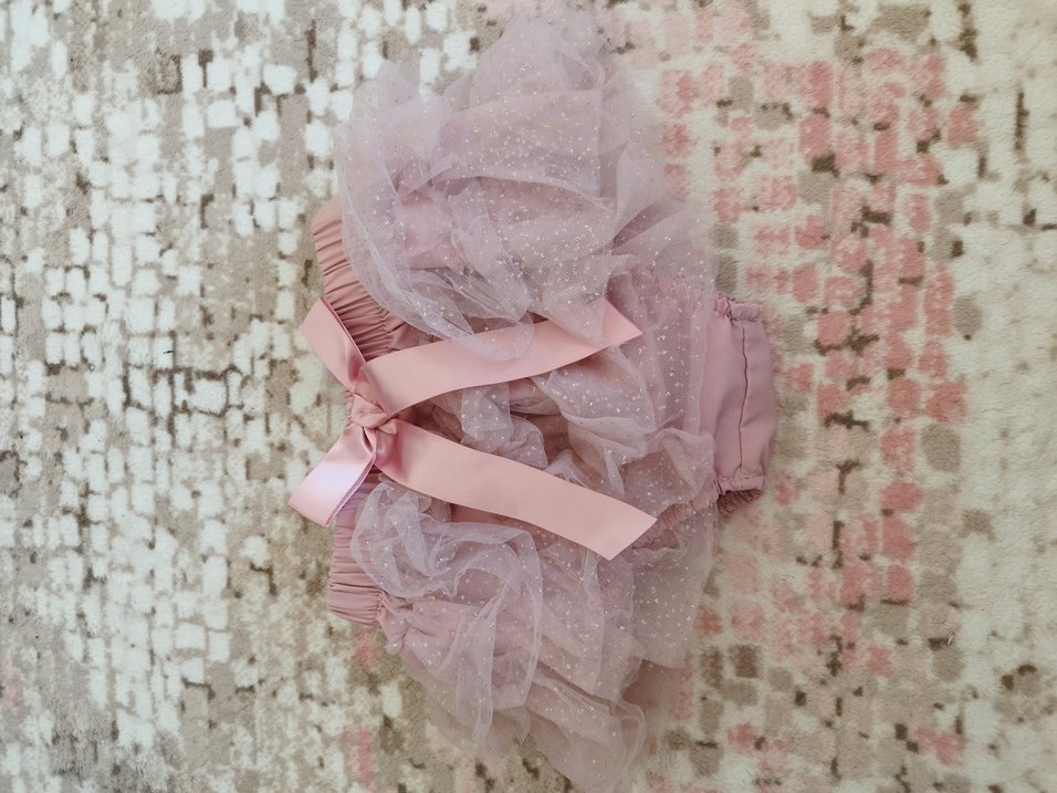 Pembe pastel renkte, nakışlı desenli, fırfır detaylı, saten kurdeleli, askılı yumuşak kumaştan külot .
