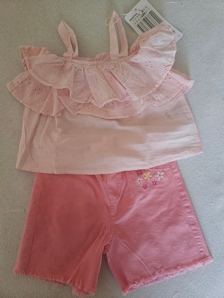 Etiketli. 4 yaş pembe renkli, fırfırlı nakış detaylı askılı üst ve çiçek nakışlı şortlu bebek kız takımı.