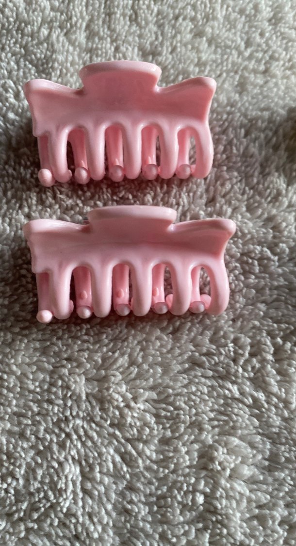 Pembe pastel renkli, plastikten yapılmış iki adet fırfırlı saç tokası seti. Rahat ve modaya uygun tarzlar için ideal bir seçim.