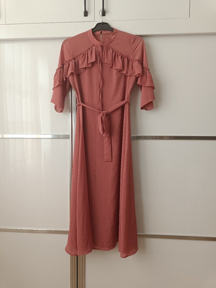 Pembe renkli bu uzun midi elbise, salaş kesim ve fırfır detaylara sahiptir. Yumuşak kumaştan, yarım kollu ve belden bağlamalıdır. Minimalist bohem tarzıyla günlük kullanıma uygundur. s m bedene uygun