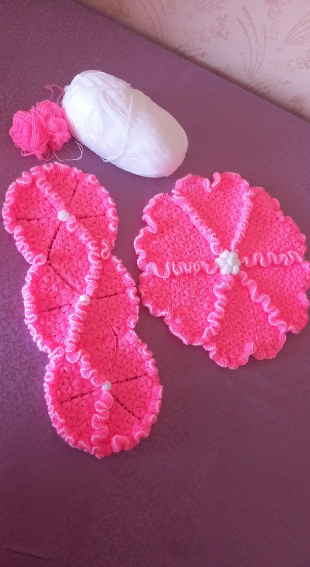 Renkli işlemeli desenlere ve fırfırlı kenarlara sahip pembe örgü , sıcak ve konforlu.