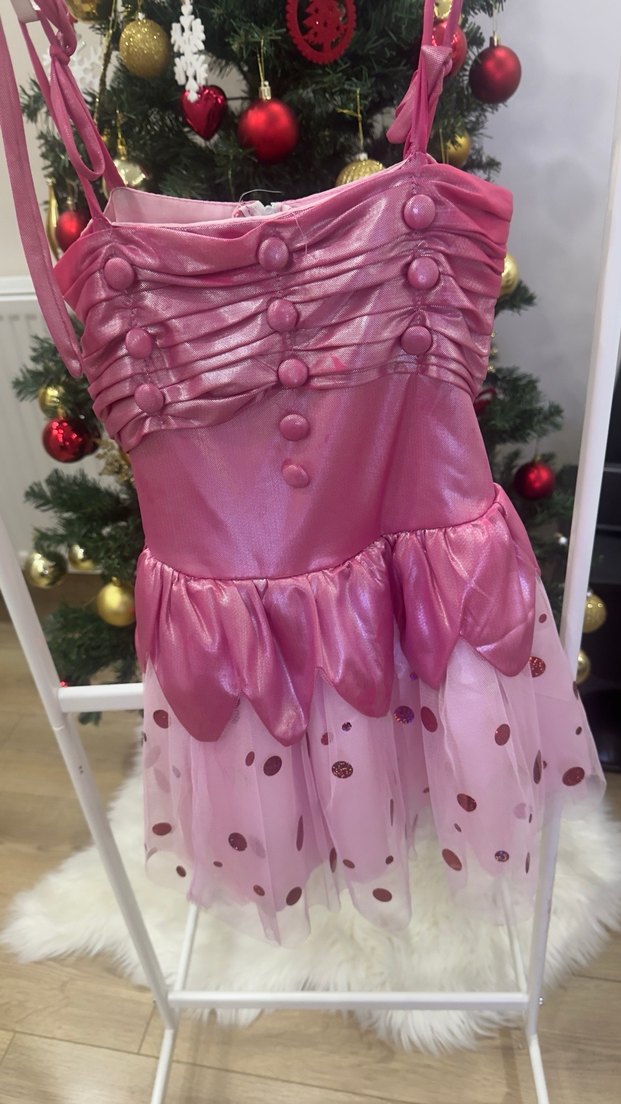 Pembe, straplez ve fırfırlı detaylara sahip, işlemeli parlak sentetik kumaştan yapılmış dar kesim kız elbisesi.