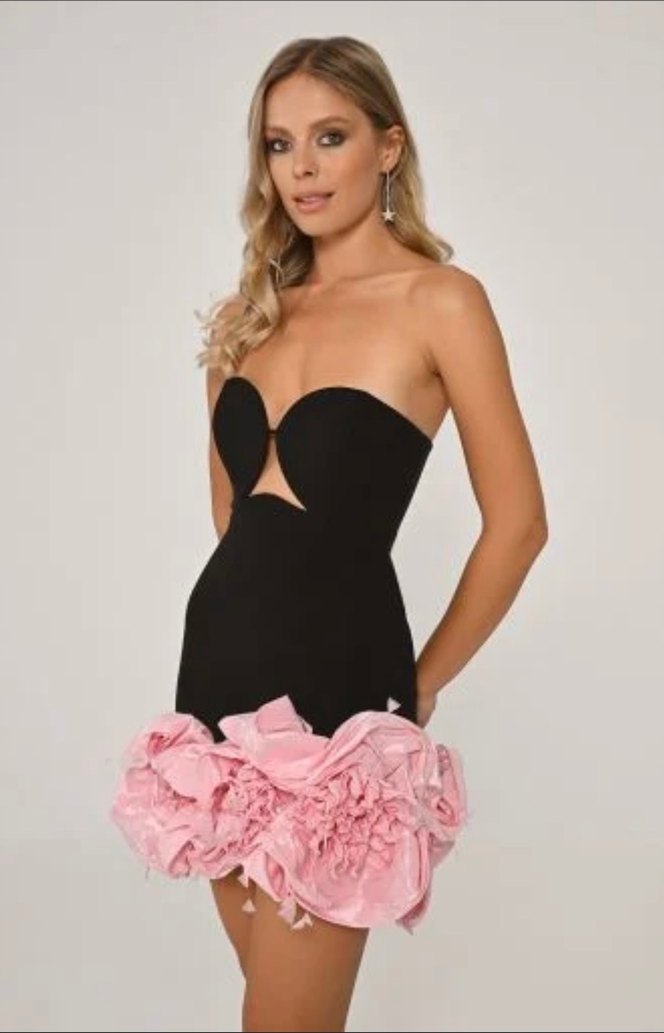 Pembe Fırfırlı Straplez Mini Abiye Elbise