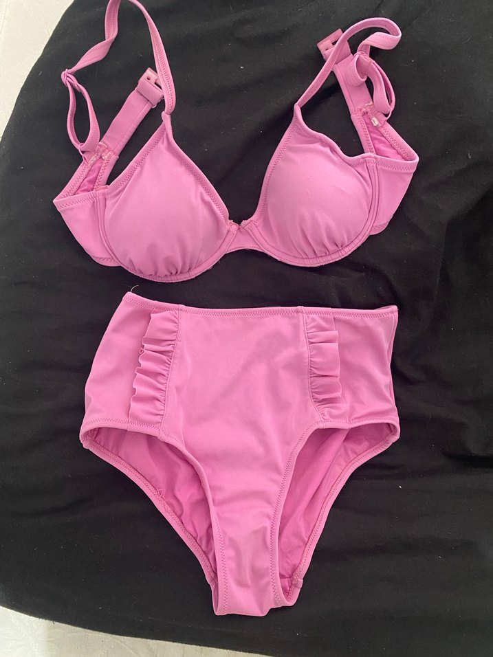 Pembe bikini, strappy askılar ve vücuda oturan kesimle tasarlanmıştır. Yüksek bel alt kısmı fırfır detaylıdır.
