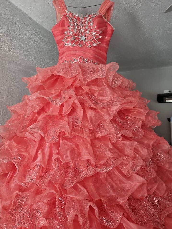 Pembe renkli bu uzun abiye, straplez yaka ve işlemeli detaylara sahiptir. Fitted üst kısmı ve kat kat fırfırlı etek kısmı ile gösterişli bir tasarıma sahiptir. Kolsuz yapısı düğünler için klasik şıklık sunar.